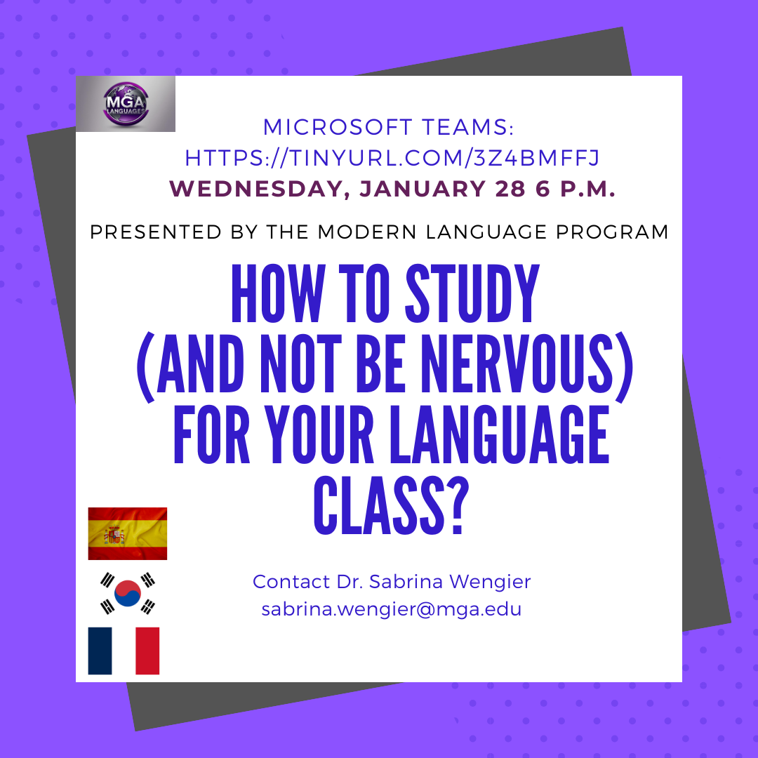 How to Study for Your Language Class and Be Less Nervous Time: 6:00PM-8:00PM Learn strategies to be successful and more confident in your language learning journey. Microsoft Teams: https://tinyurl.com/3Z4BMFFJ Contact: Dr. Sabrina Wengier