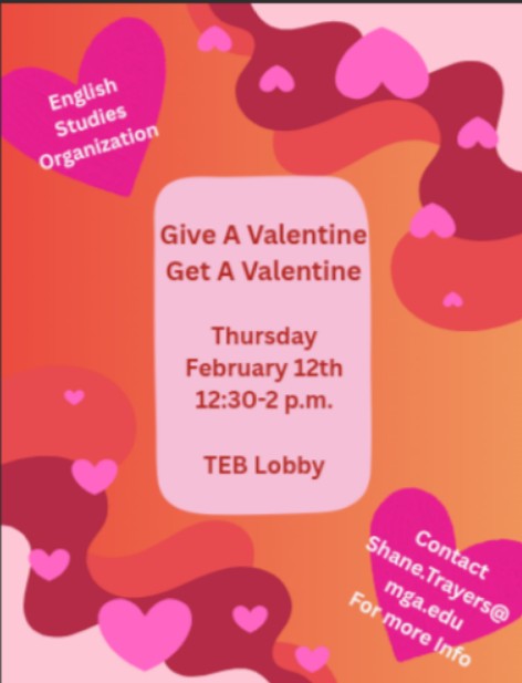 Give a Valentine/Get a Valentine Time: 12:30PM-2:00PM Make a valentine for someone and get one for yourself. This event ensures everyone feels loved on Valentines Day (or as close to it as we can get with it being on a Saturday). Contact: Dr. Shane Trayers